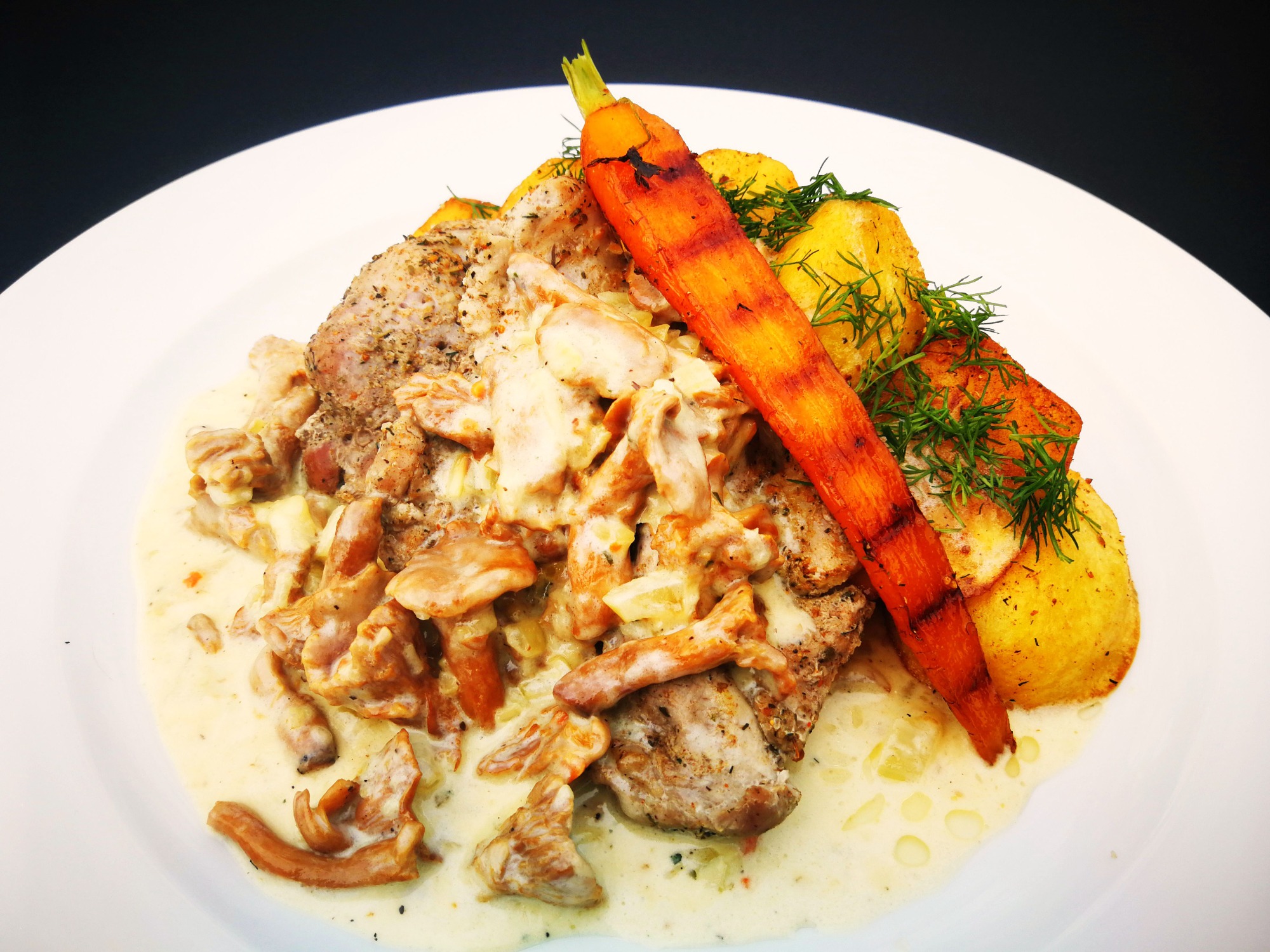 filet z kurczaka w chrupiącej panierce z płatków kukurydzianych, frytki, marchew z brzoskwinią