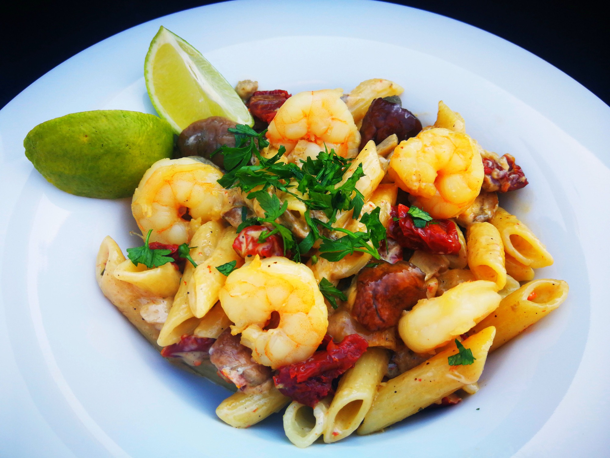 Penne zapiekane z szynką, warzywami i prażoną cebulką